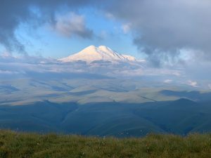 Эльбрус – одно из удивительных и величественных мест мира. Он расположен на стыке двух республик – Кабардино-Балкарии и Карачаево-Черкессии, — и является самой высокой точкой Европы. Эльбрус имеет две обособленные вершины: западная в высоту достигает 5642 м над уровнем моря, высота восточной – 5621 м. Какие только эпитеты не присваивали этой горе: двуглавый красавец, гора Богов, горя счастья, спящий Великан… Есть еще одно негласное название у Эльбруса – Малая Антарктида: огромная белоснежная ледяная шапка не сходит с вершины горы круглый год.